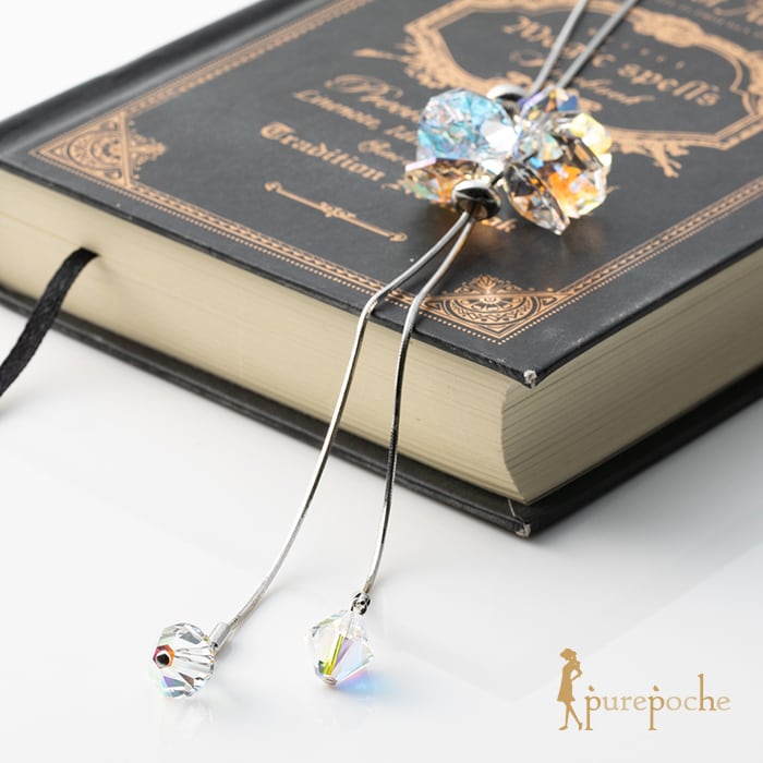 虹色に輝くクリスタルガラスをふんだんに使用したラリエットです。クリスタルガラスの部分はスライド式になっており、自由にお好きな位置で留めることが可能です。クリスタルガラスならではの煌きをお楽しみいただける商品となっております。