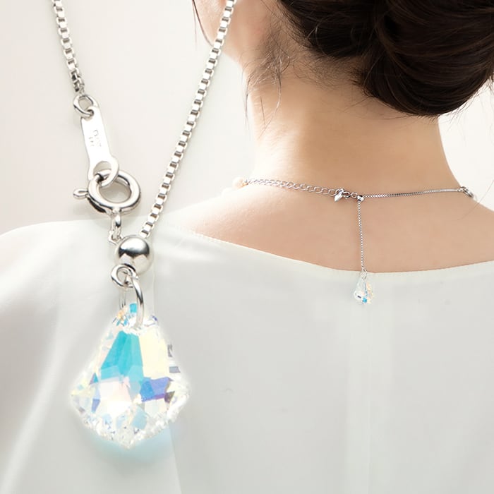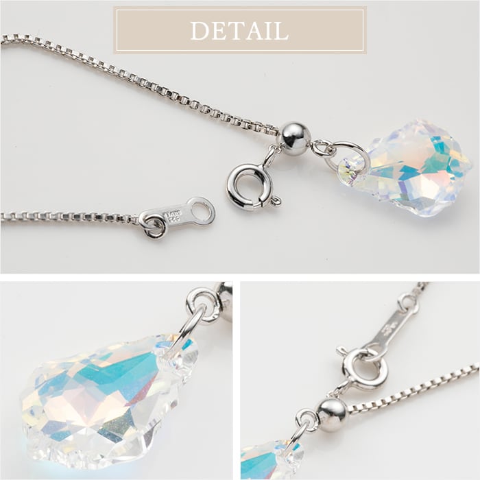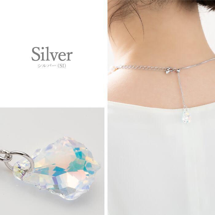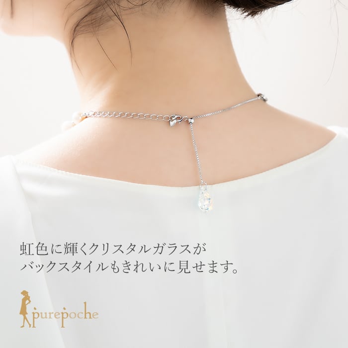 お手持ちのネックレスの長さを簡単に調整できるバックスライドアジャスターとなっています。虹色に輝くクリスタルガラスがバックスタイルもきれいに見せます。