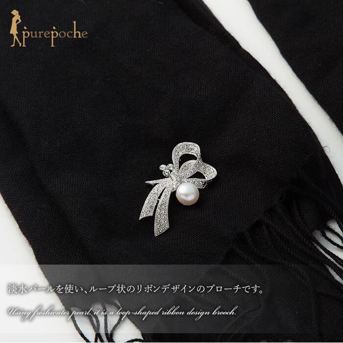 淡水パールを使い、ループ状のリボンデザインのブローチです。使いやすい形状と大きさで、ジャケットの襟元のほか、ストールに留めたりといろいろ使えます。