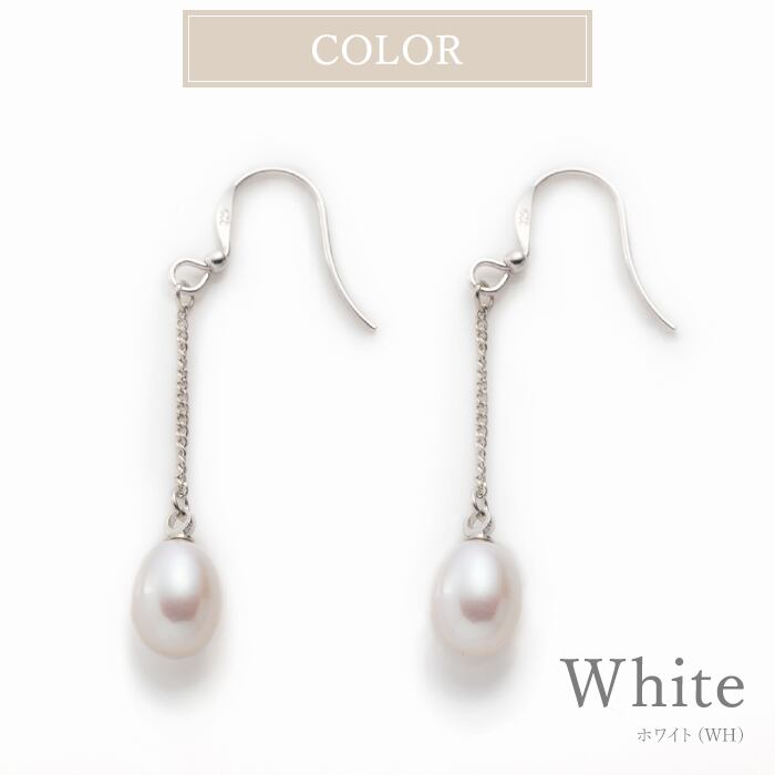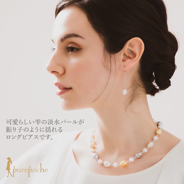 可愛らしい雫の淡水パールが振り子のように揺れるロングピアスです。小顔効果もあり、ピアスフックはSV925を使用しているためアレルギーの方も安心してつけられます。