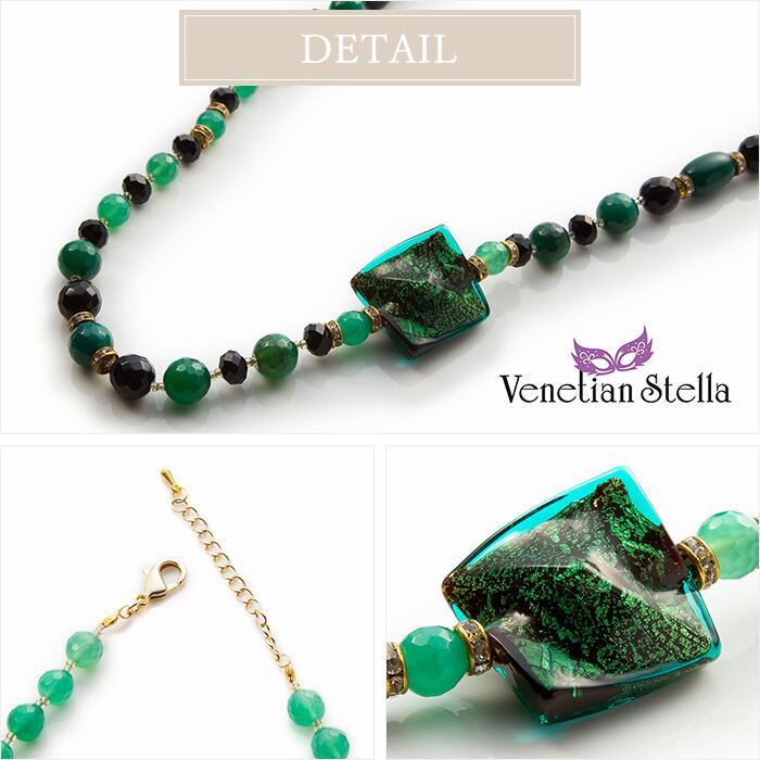 深い森、深緑を表現したヴェネチアンビーズをトップに使ったランクアップしたネックレスです。オンオフに使える大人の雰囲気の逸品です