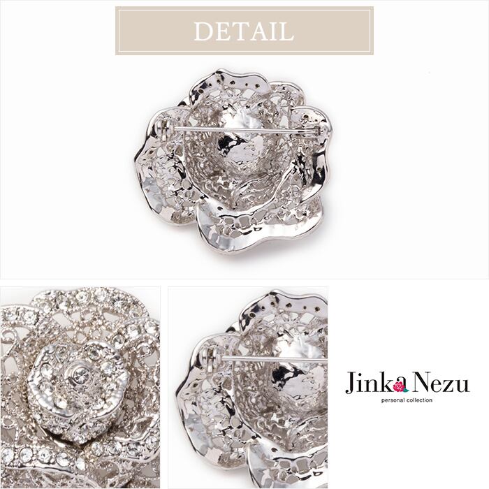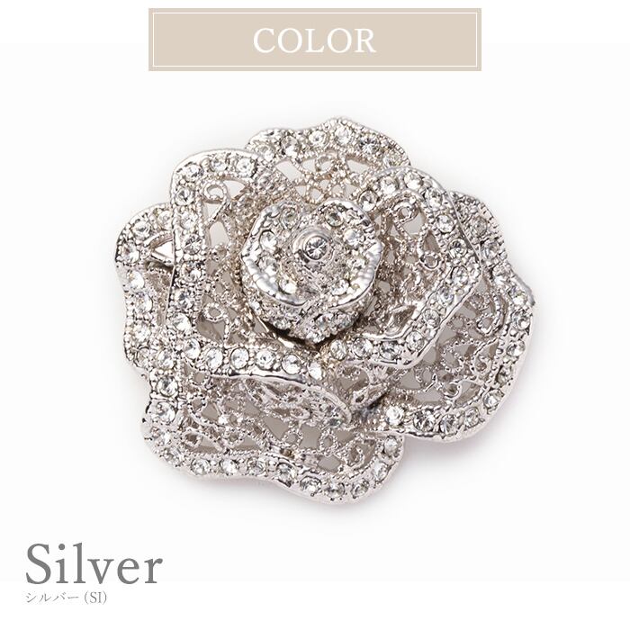 ローズモチーフのレース調のエレガントなブローチです。使いやすい大きさなので、襟元のほか、ストールや帽子などに着けても楽しめます。