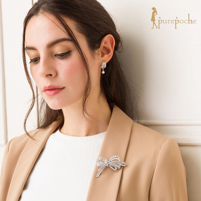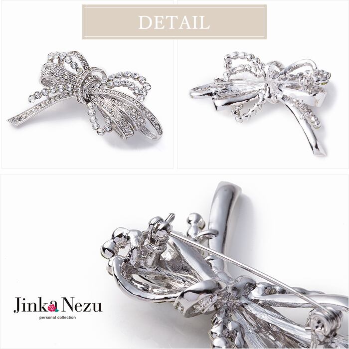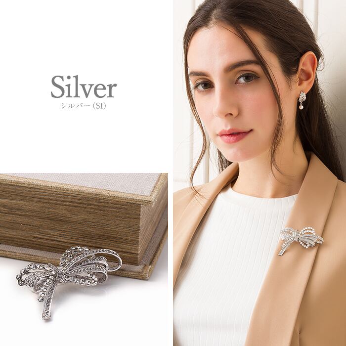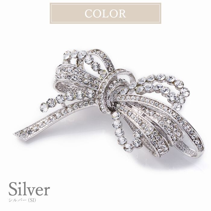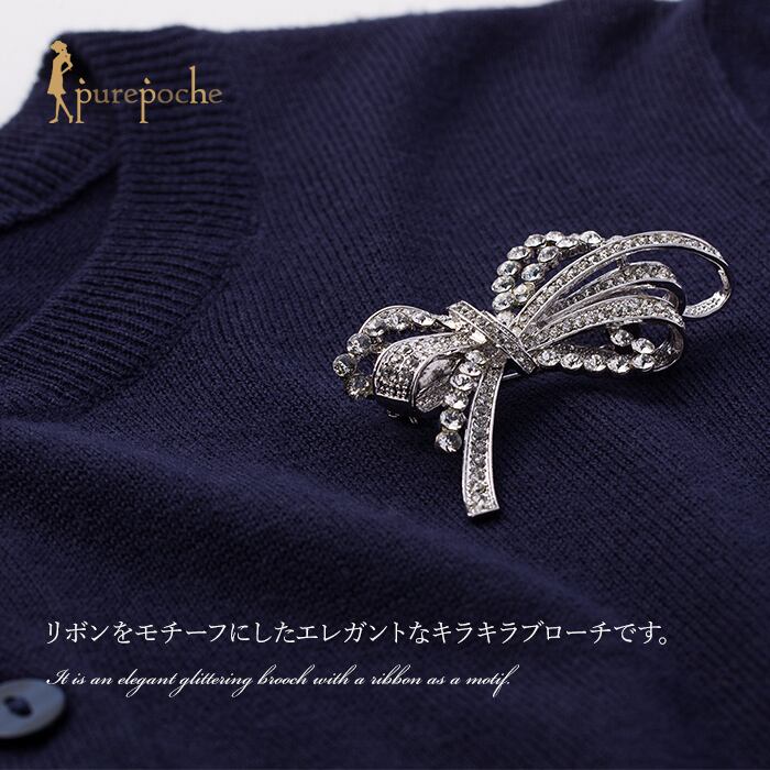 リボンをモチーフにしたエレガントなキラキラブローチです。クリスタルガラスを用いたリボンをアレンジしたデザインのです。使いやすい大きさなので、襟元のほか、ストールや帽子などに着けても楽しめます。
