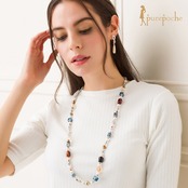ニュアンスカラーの素材で、キラキラ、フェミニンなロングネックレスです。シックな色あいなので、年齢問わずお使いいただけます。きらきらと輝くシックなネックレスです。