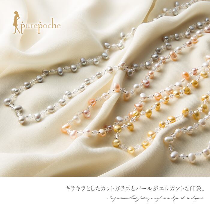 キラキラとしたカットガラスとパールがエレガントな印象。金具で両端を留めることで2連が可能