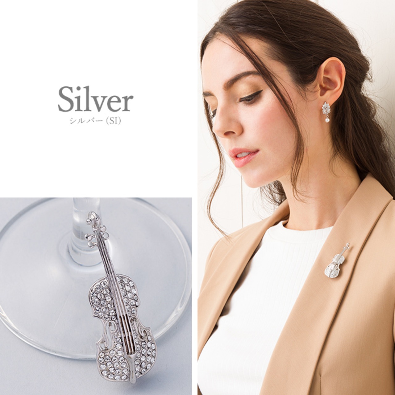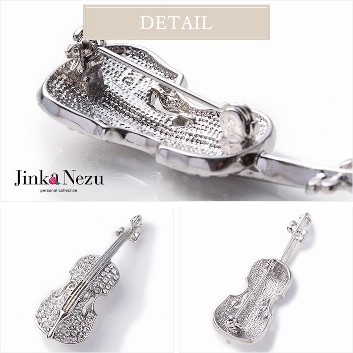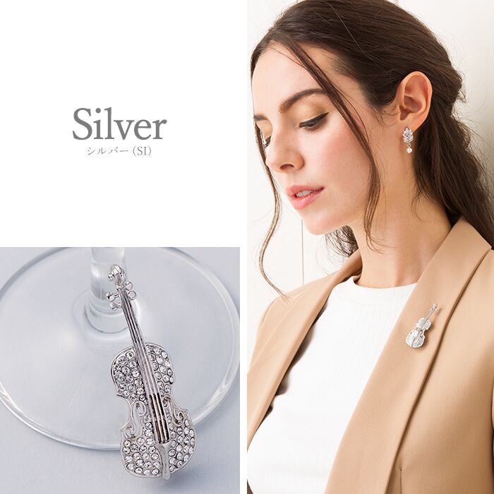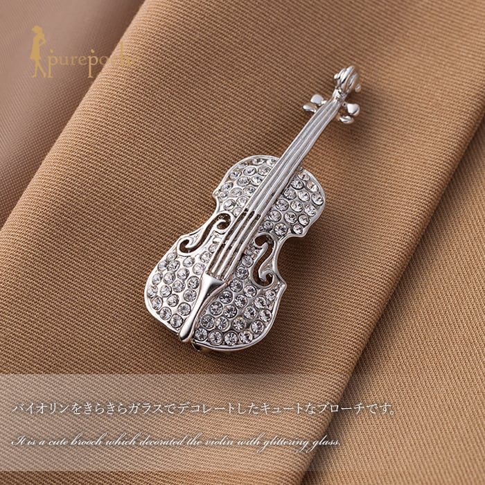 バイオリンをきらきらガラスでデコレートしたキュートなブローチです。音色を奏でるように、胸元を華麗に彩ります。