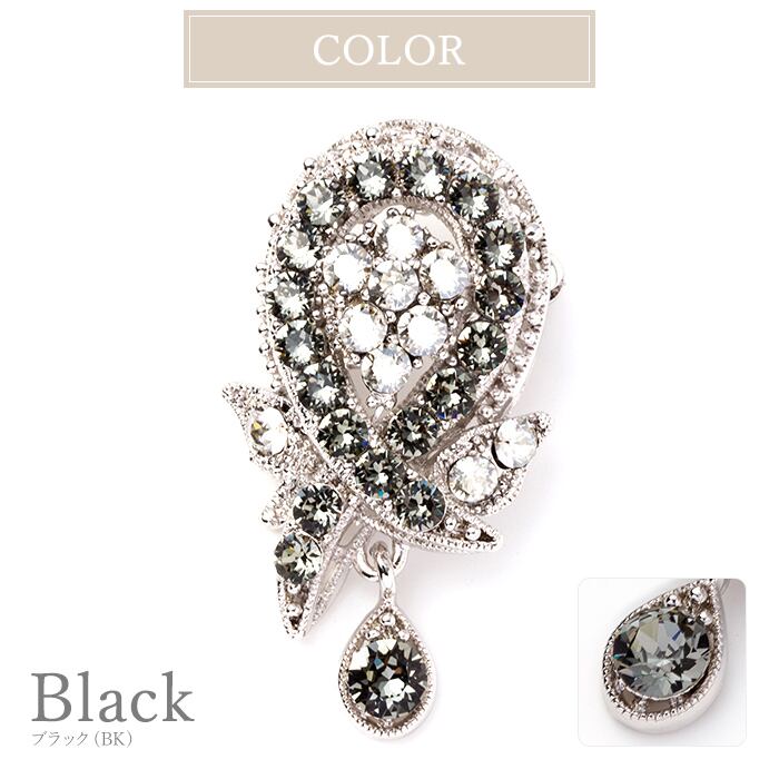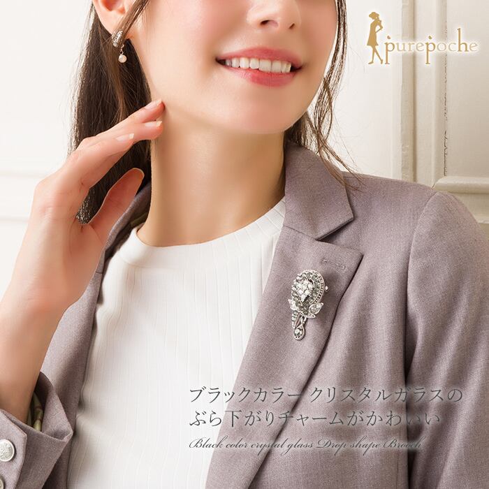 ドロップシェイプのエレガントなブローチです。ブラックダイヤモンドカラーのクリスタルガラスを用いたぶら下がりチャームもかわいいです。使いやすい大きさなので、襟元のほか、ストールや帽子などに着けても楽しめます。ペンダントヘッドとしてもご使用いただけます。