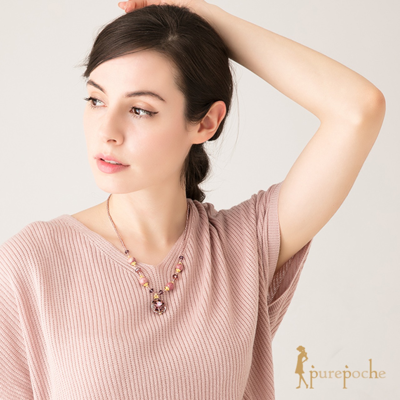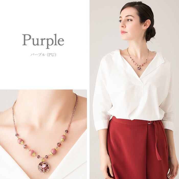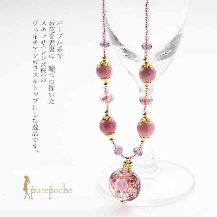 パープル系でお花を表裏に一輪づつ描いたスキッサ(レンズ形)のヴェネチアンガラスをトップにネックレスを仕上げ、キュートでありながら大人の雰囲気のある逸品です。