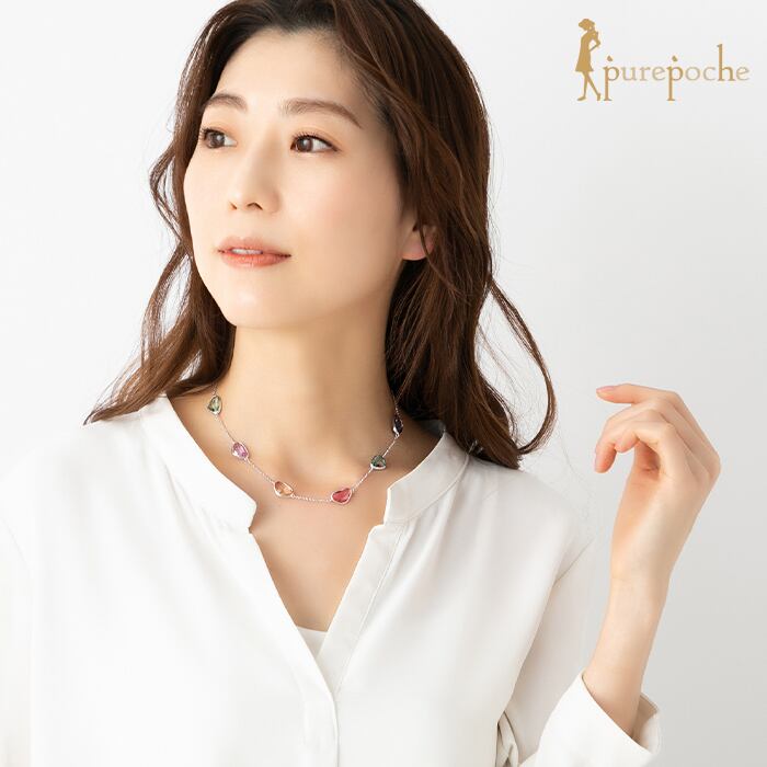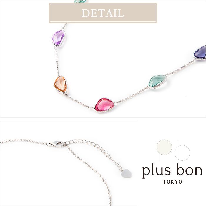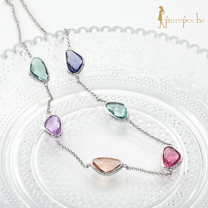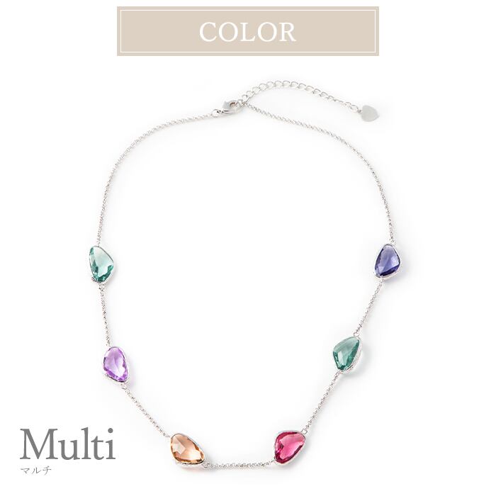 発色の良い5色のガラスをステーションネックレスにしました。カラフルだけど、合わせやす色味が人気のネックレスです。