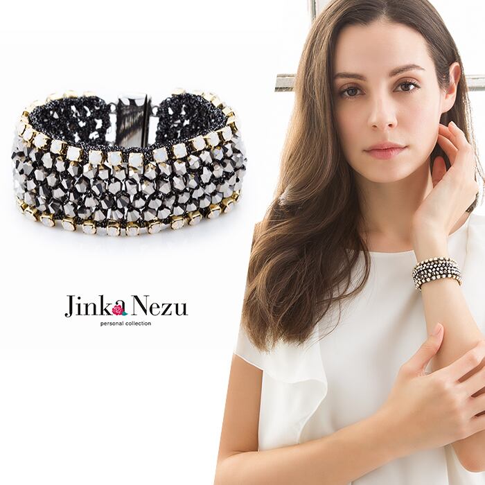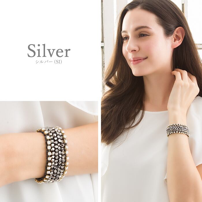 ブロンズカラーのカットガラスをふんだんに使用したブレスレットです。シックな色合いで、洗練された大人の雰囲気を演出。留め具はマグネット式なので、着脱もスムーズです。