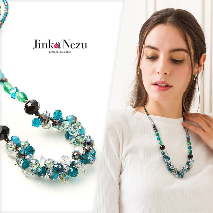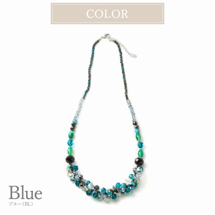 さまざまなブルー系の色合いのビーズをふんだんに使った、ニュアンスのあるネックレスです。繊細でゴージャスなキラキラネックレスです。