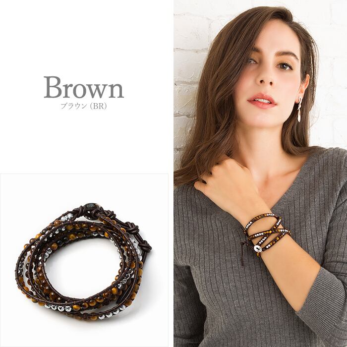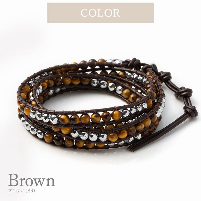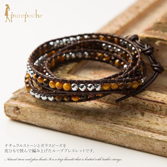 ナチュラルストーンとガラスビーズを皮ひもで挟んで編み上げたループブレスレットです。3〜4連のブレスレットとしてお使いいただけます。