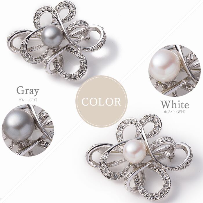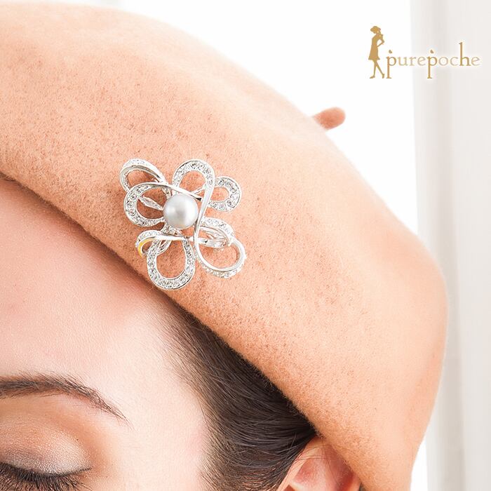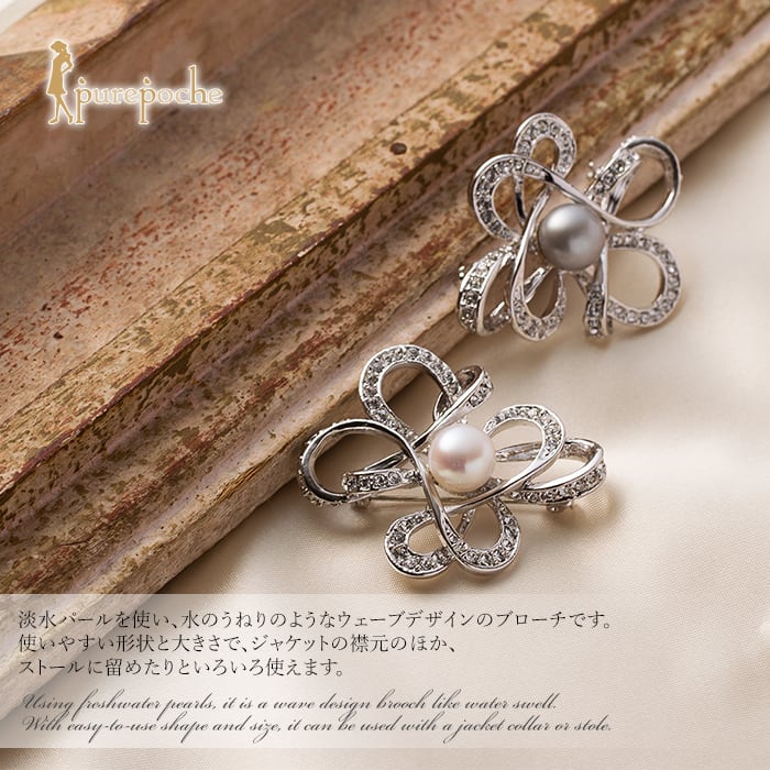 淡水パールを使い、水のうねりのようなウェーブデザインのブローチです。使いやすい形状と大きさで、ジャケットの襟元のほか、ストールに留めたりといろいろ使えます。