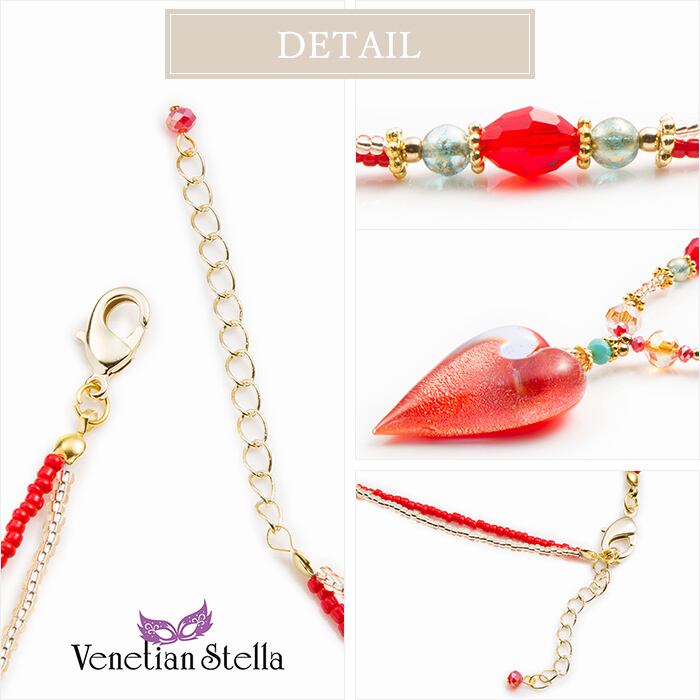 ネックレス ショート ヴェネチアン ベネチアン グラス ガラス ハート 朱色 多面カット