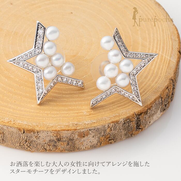お洒落を楽しむ大人の女性に向けてアレンジを施したスターモチーフをデザインしました。優しい輝きを放つため、モチーフを1.2mmのごく小さなCZで縁取っています。中央の淡水パールは4mmUPのサイズを片耳に6pcs使用し、零れ落ちるようなフォルムになるように配置にこだわりました。程よい大きさで耳たぶにフィットするようにサイズ感にもこだわりました。