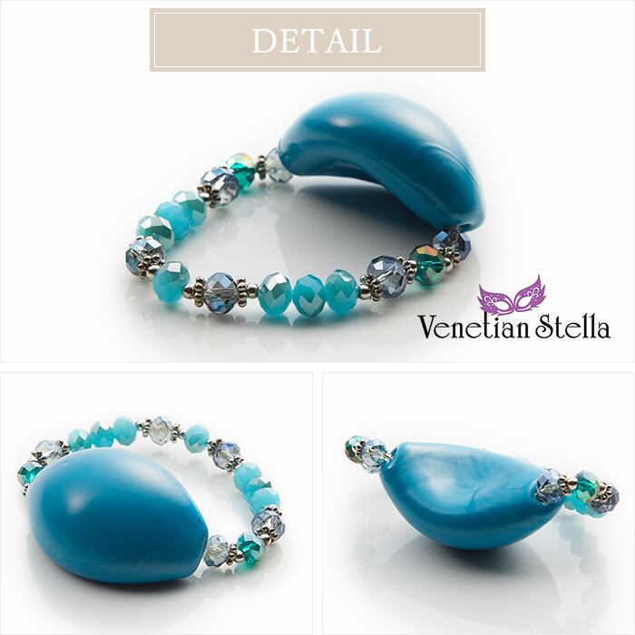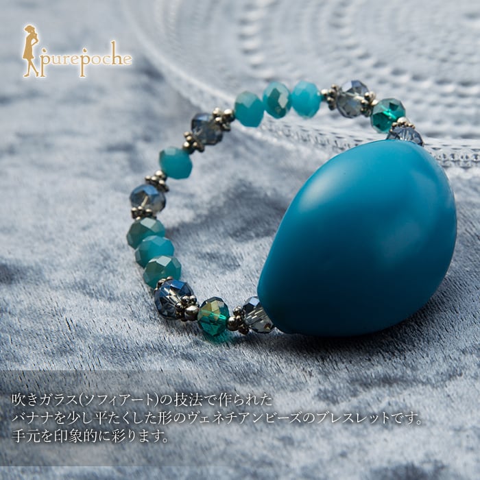 吹きガラス(ソフィアート)の技法で作られたバナナを少し平たくした形のヴェネチアンビーズのブレスレットです。手元を印象的に彩ります。手首のカーブに沿いやすいので、使いやすくなってますいストレッチタイプです。吹きガラスですので、ボリュームの割に軽く仕上がってます。