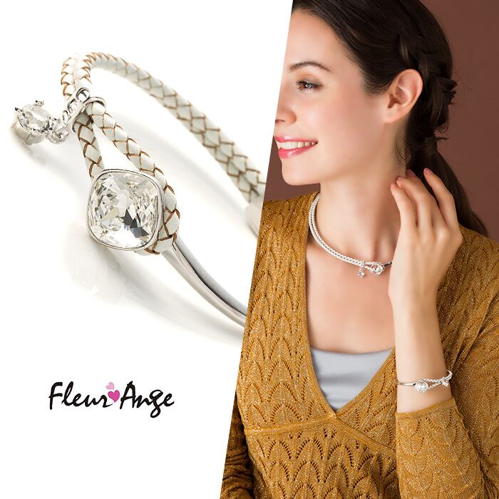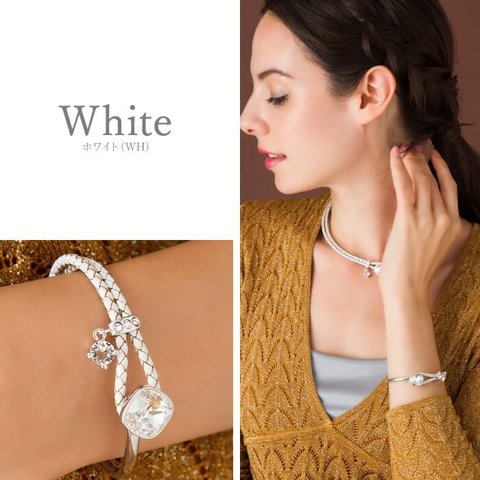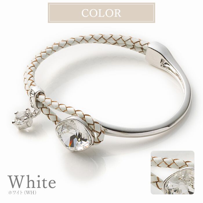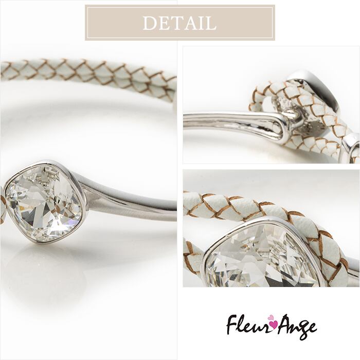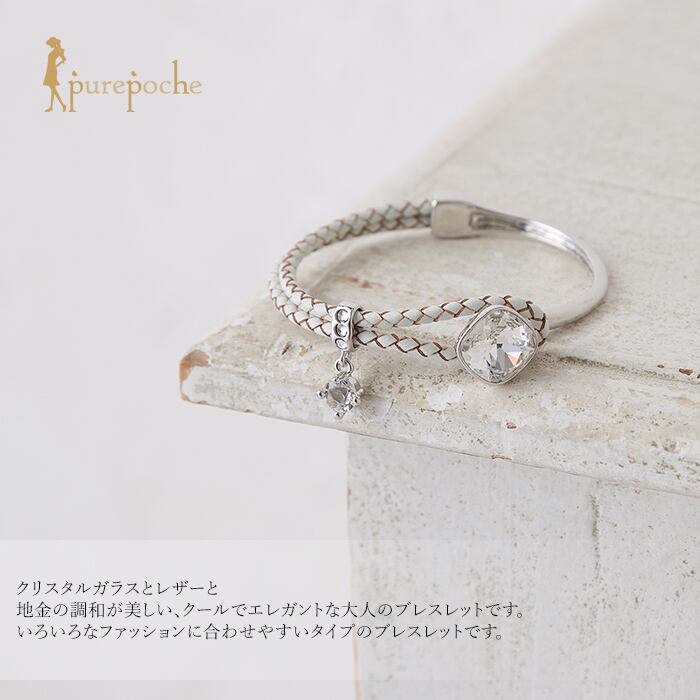 クリスタルガラスとレザーと地金の調和が美しい、クールでエレガントな大人のブレスレットです。いろいろなファッションに合わせやすいタイプのブレスレットです。