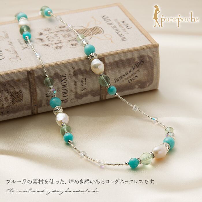 ブルー系の素材を使った、煌めき感のあるロングネックレスです。ブルーやグリーンの色あいのきらきらと輝くシックなネックレスです。