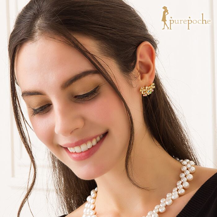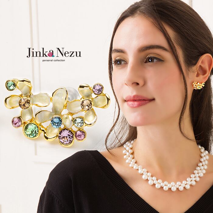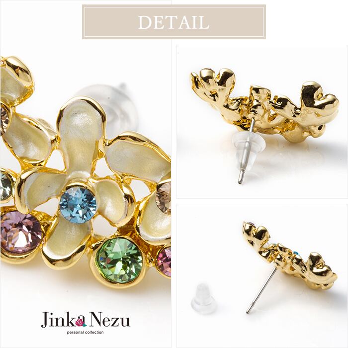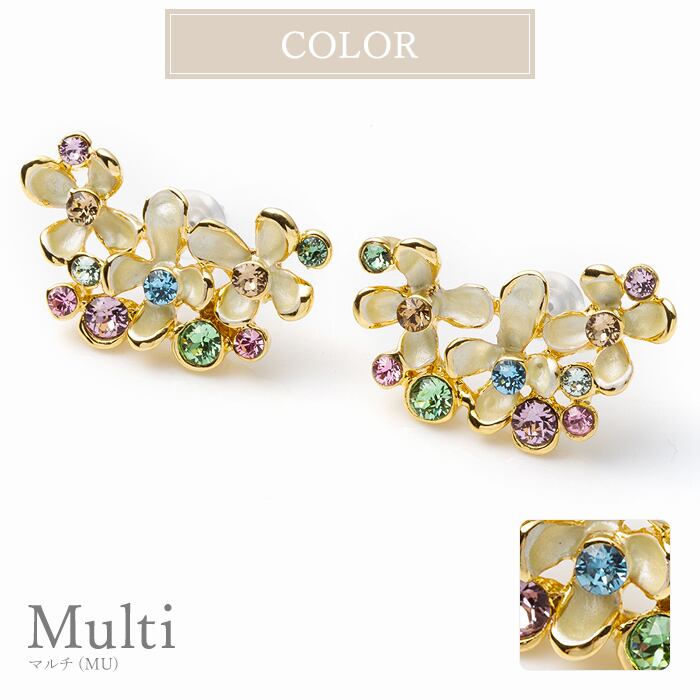 いろいろな色のクリスタルガラスの煌めきと可憐なお花の組み合わせが耳元を華やかに彩るピアスです。お庭に咲き乱れる花々がモチーフです。