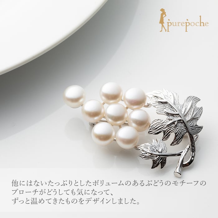 他にはないたっぷりとしたボリュームのあるぶどうのモチーフのブローチがどうしても気になって、ずっと温めてきたものをデザインしました。ボリュームはあってもすっきりとしたフォルムにしたかったので、淡水パールは9mmUPのサイズのものを大胆に8個使って房部分を表現。淡水パールの美しさを効果的に表現できるバランスと配置にこだわって試作を繰り返したうえで仕上げた一品になります。