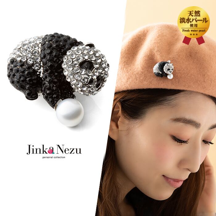 パンダをモチーフにした遊び心のあるブローチです。キラキラとした輝きと大粒の淡水パールが胸元をエレガントに演出します。