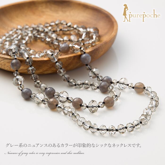 グレー系のニュアンスのあるカラーが印象的なシックなネックレスです。ポイントにメノウを使い、きらきらビーズでエレガンスさをプラスしています。さっとかぶって使えるロングネックレスです。