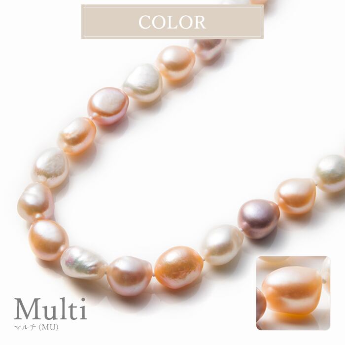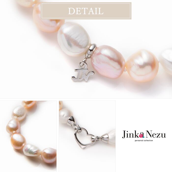 淡水バロックパールを使った、存在感のある大珠ネックレスにJNのブランドのイニシャルと可愛らしいオープンハートの留め金具。天然色の大粒淡水バロックパールを贅沢に使ったネックレスで、約11.5mm upの珠を使った逸品です。 オレンジ系、パープル系、ホワイトと、天然カラーの珠をマルチに配した華やかでゴージャスなネックレスです。 フォーマルからカジュアルまで華麗に胸元を彩ります。