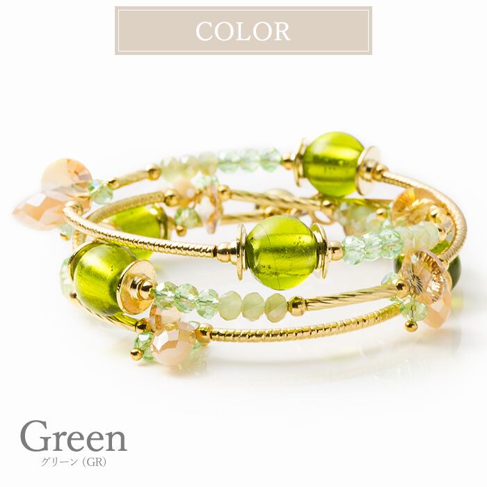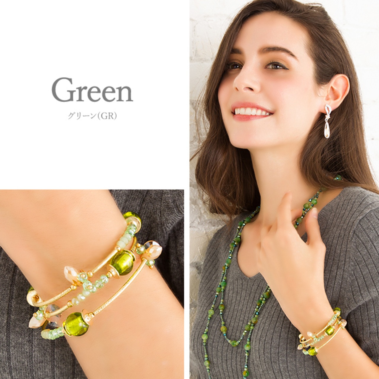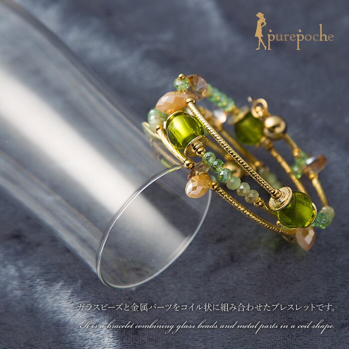 ガラスビーズと金属パーツをコイル状に組み合わせたブレスレットです。留め具のないコイル状なので脱着しやすく、スタイリッシュに装えます。
