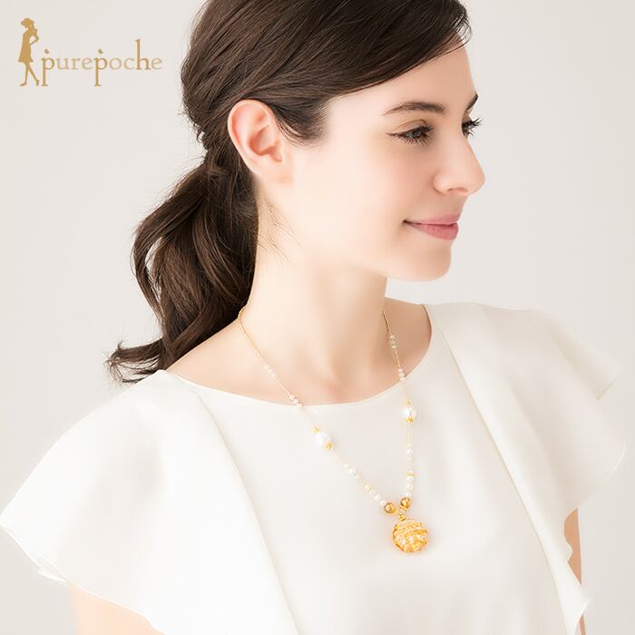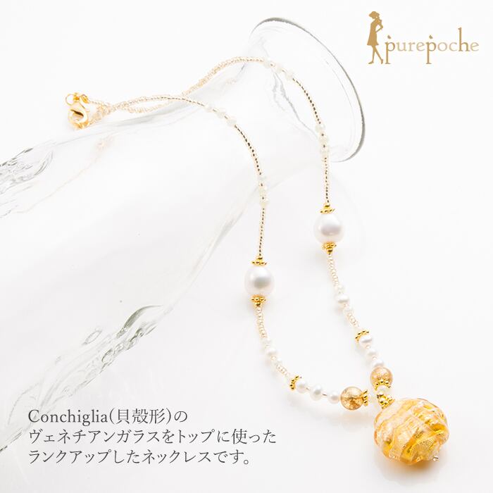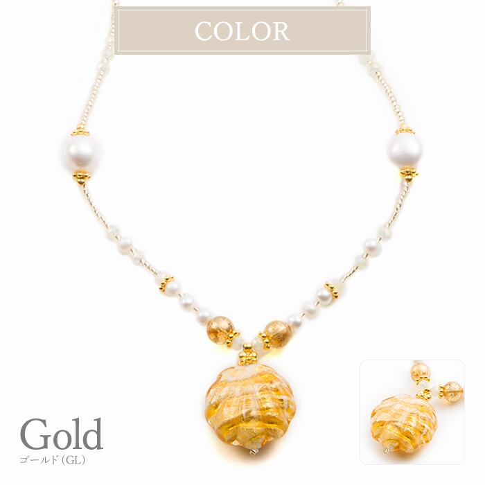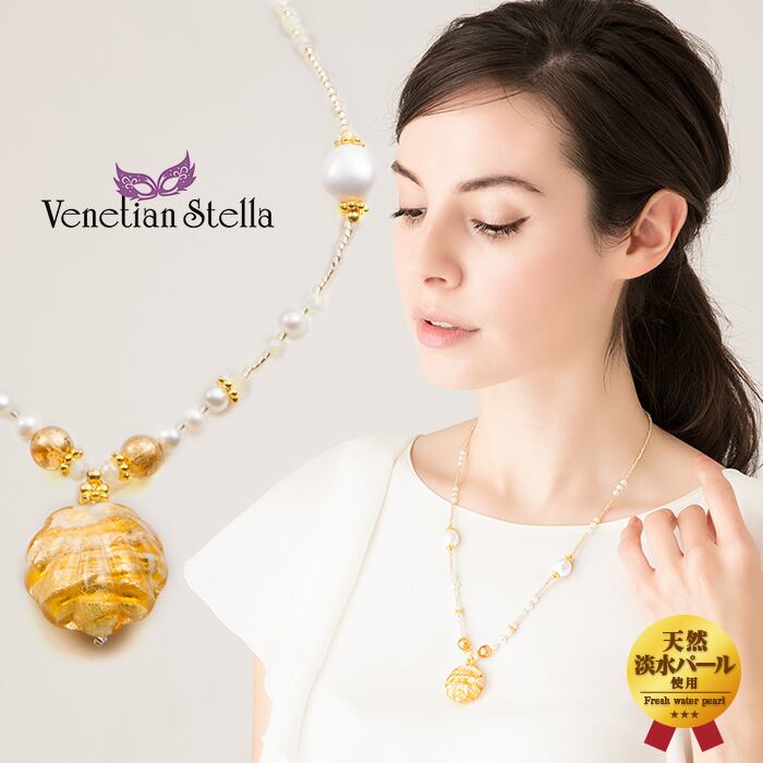 ネックレス ショート 淡水パール ヴェネチアン ベネチアン グラス ガラス 貝 海 夏 金色