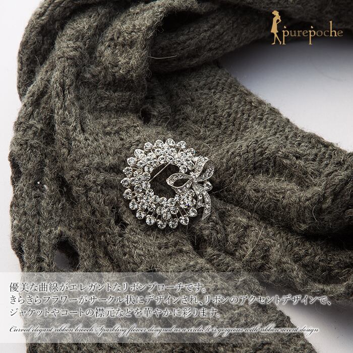 優美な曲線がエレガントなリボンブローチです。きらきらフラワーがサークル状にデザインされ、リボンのアクセントデザインで、ジャケットやコートの襟元などを華やかに彩ります。