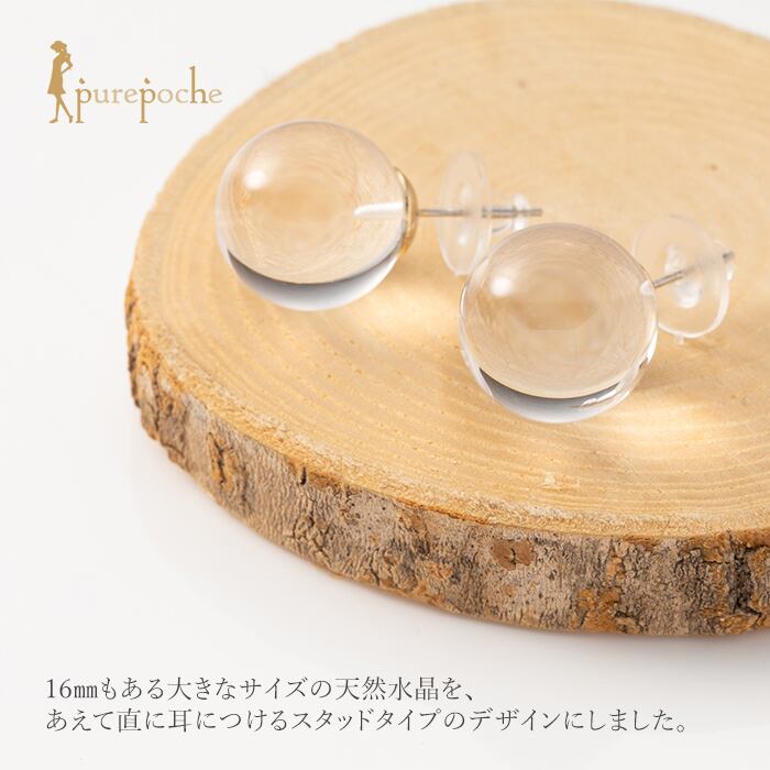 16mmもある大きなサイズの天然水晶を、あえて直に耳につけるスタッズタイプのデザインにしました。非常にシンプルですがとてもインパクトがあり、他にはないデザインになると確信し、こだわりを持ってデザインしています。