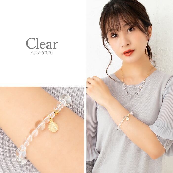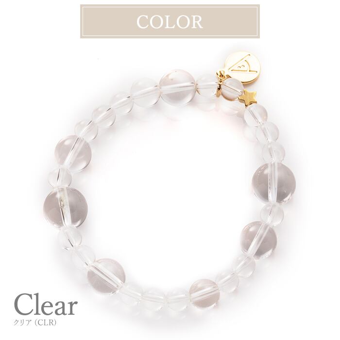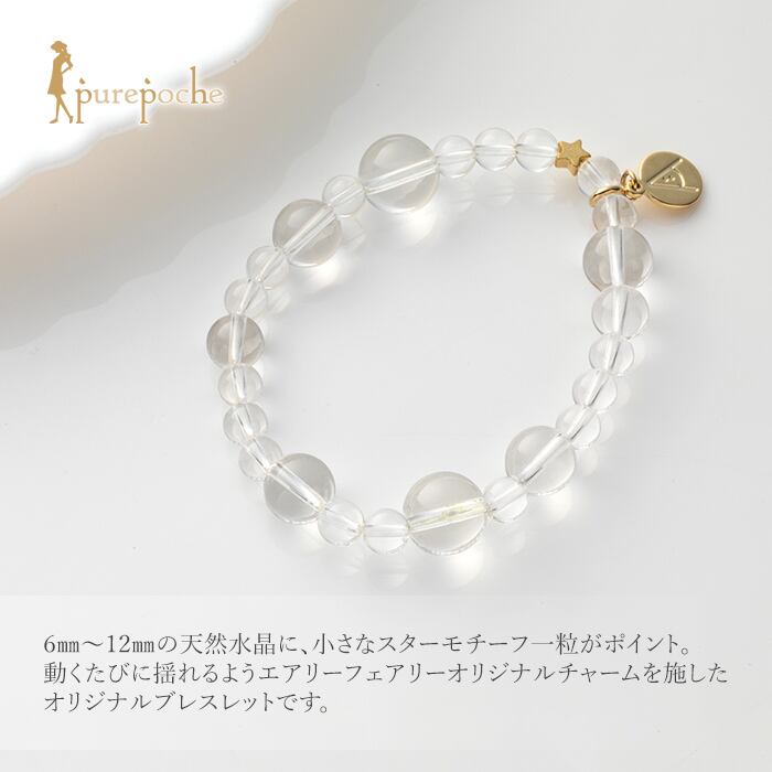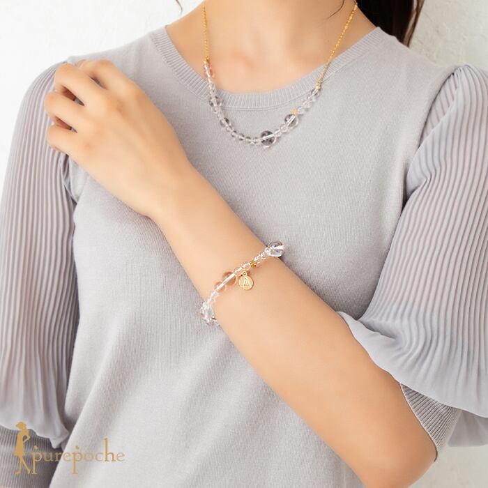 6mm〜12mmの天然水晶をバランスにこだわって配し、ゴールドドーンカラーの小さなスターモチーフを一粒ポイントに組み込みました。華奢になりすぎず大人の女性が付けやすいボリューム感になるようにこだわりました。すべてつるりとしたラウンドビーズを使用しているため、肌触りがひんやりと滑らかで身に着けていて負担を感じません。