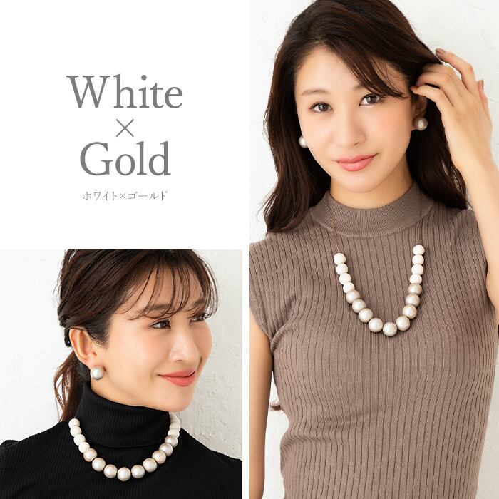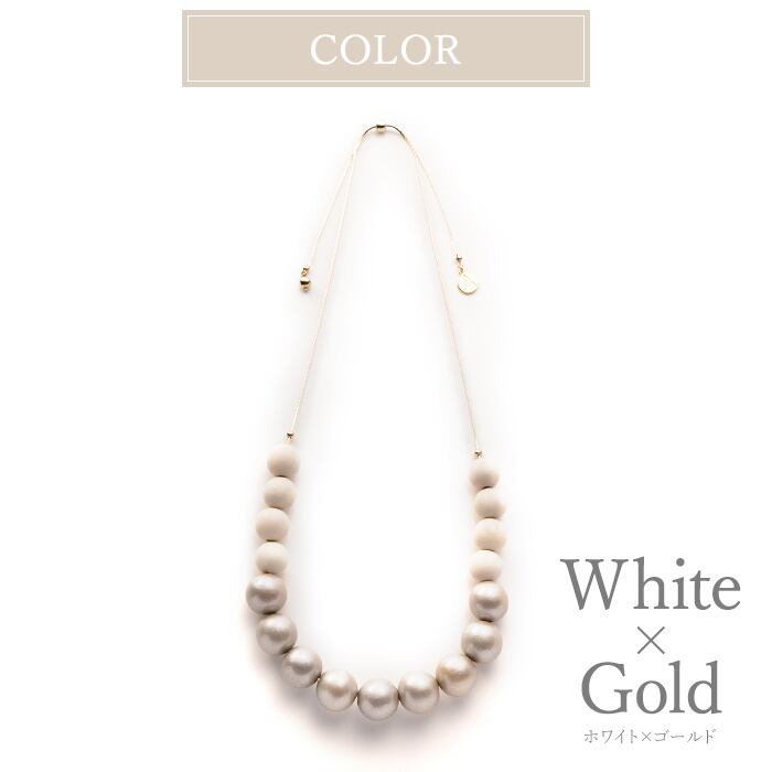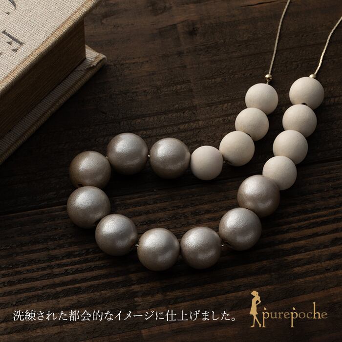 光沢のあるシャンパンゴールドカラーと、ぬくもりのあるマットなホワイトカラーのウッドビーズを、しなやかなエレガンスチェーンと組み合わせることで洗練された都会的なイメージに仕上げました。ロング、ショートで使用できるよう、ウッドの使用バランス・サイズ感にこだわり、アレンジを楽しめるようにデザインしました。