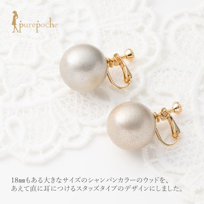 18mmもある大きなサイズのシャンパンカラーのウッドを、あえて直に耳につけるスタッズタイプのデザインにしました。非常にシンプルですがとてもインパクトがあり、他にはないデザインになると確信し、こだわりを持ってデザインしています。サイズは大きいですが、ウッド素材のためとても軽い仕上がりになっています。