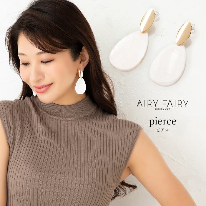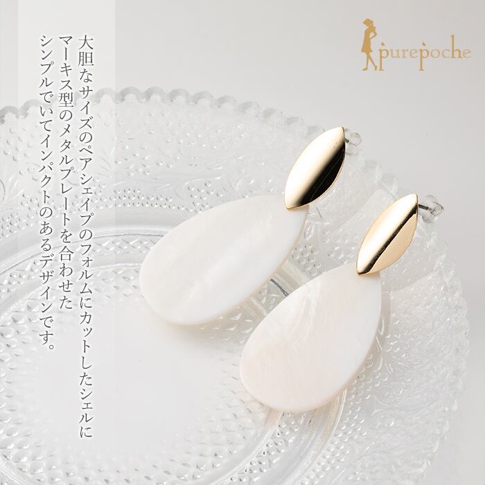 大胆なサイズのペアシェイプのフォルムにカットしたシェルにマーキス型のメタルプレートを合わせたシンプルでいてインパクトのあるデザインです。耳元で効果的にシェルが揺れるように、メタルのサイズやフォルムにこだわりました。