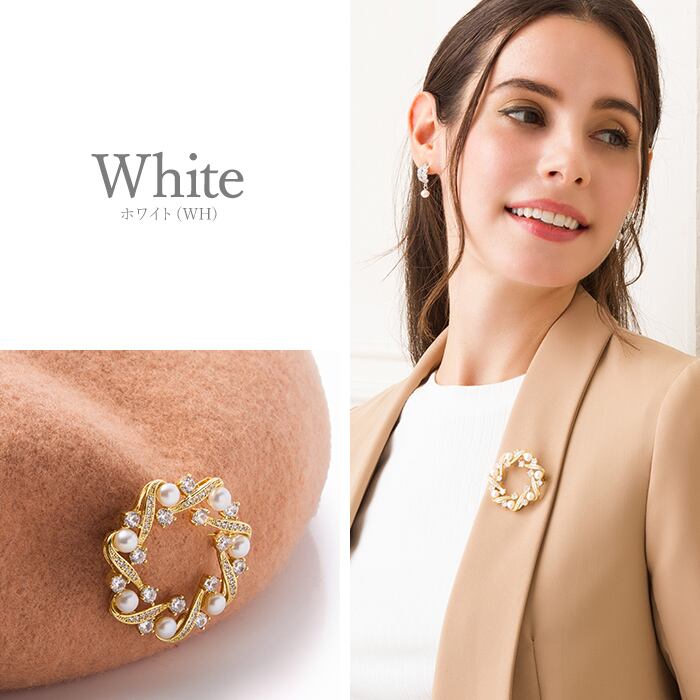 淡水パールを使ったリースモチーフのブローチです。エレガントで使いやすい大きさなので、襟元のほか、ストールや帽子などに着けても楽しめます。