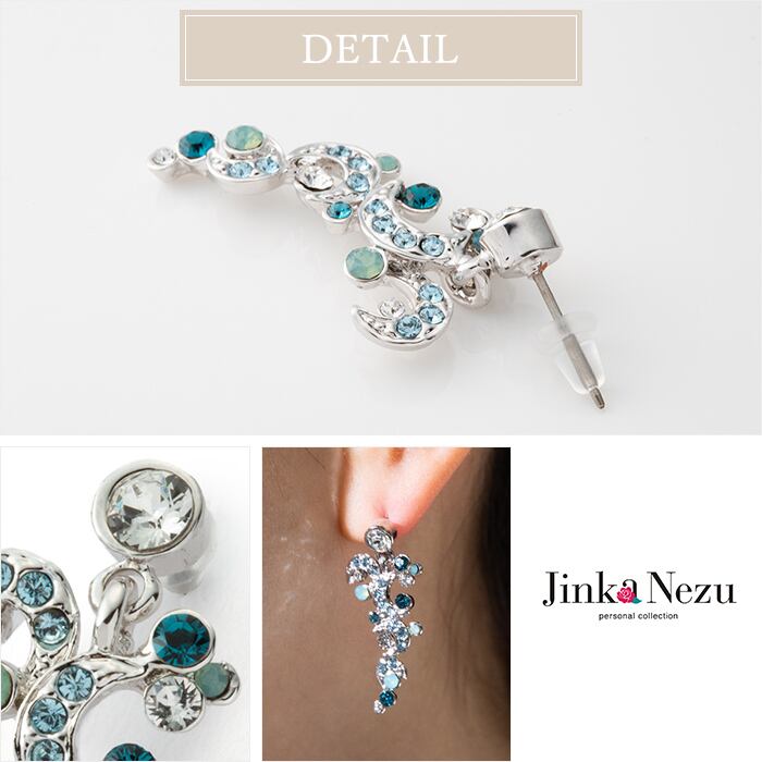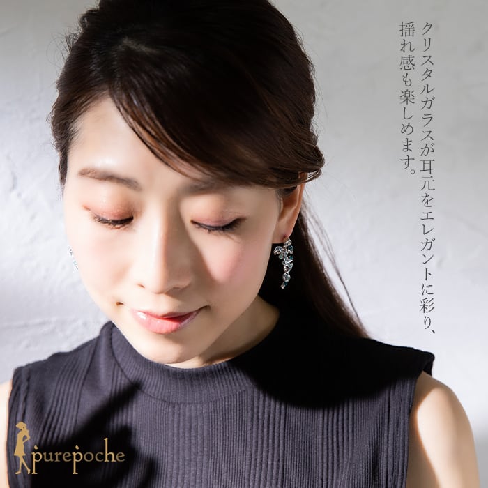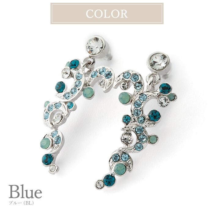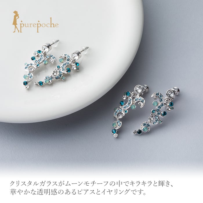 ブルーカラーのクリスタルガラスのピアスです。クリスタルガラスがムーンモチーフの中でキラキラと輝き、華やかな透明感のあるピアスです。クリスタルガラスが耳元をエレガントに彩り、揺れ感も楽しめます。