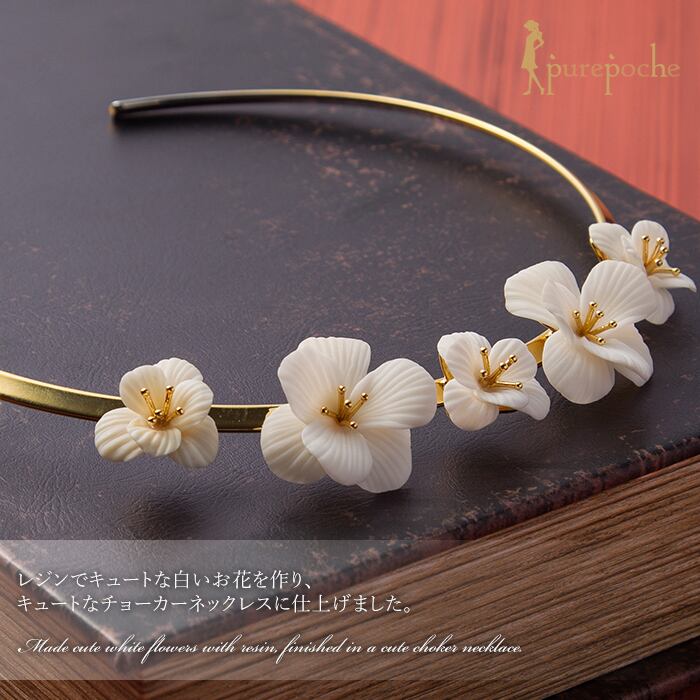 レジンでキュートな白いお花を作り、キュートなチョーカーネックレスに仕上げました。