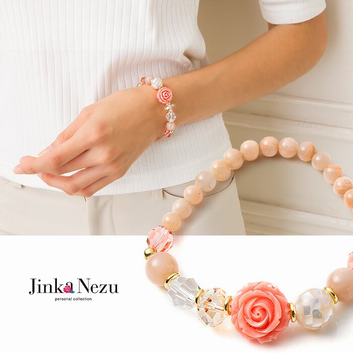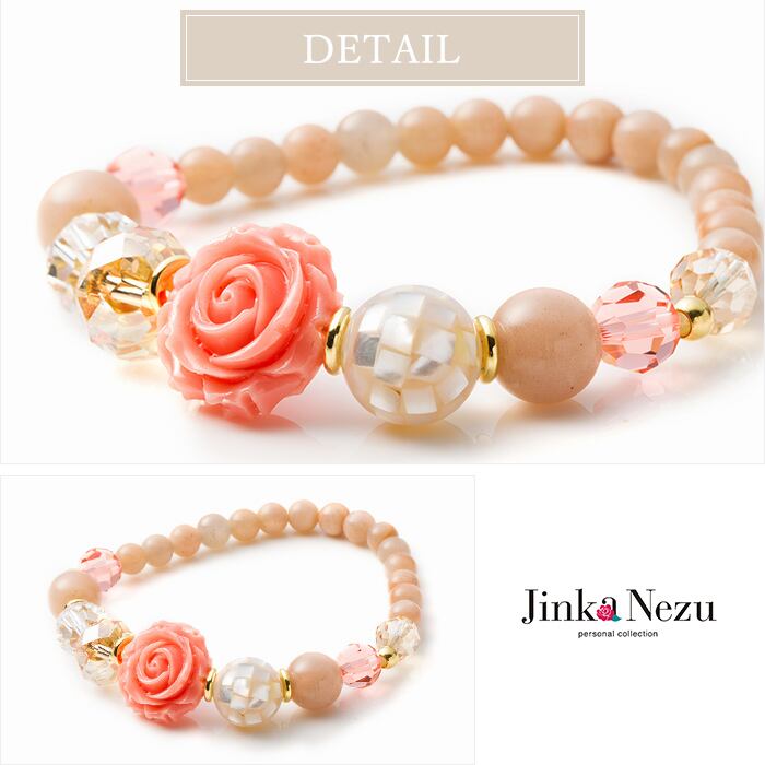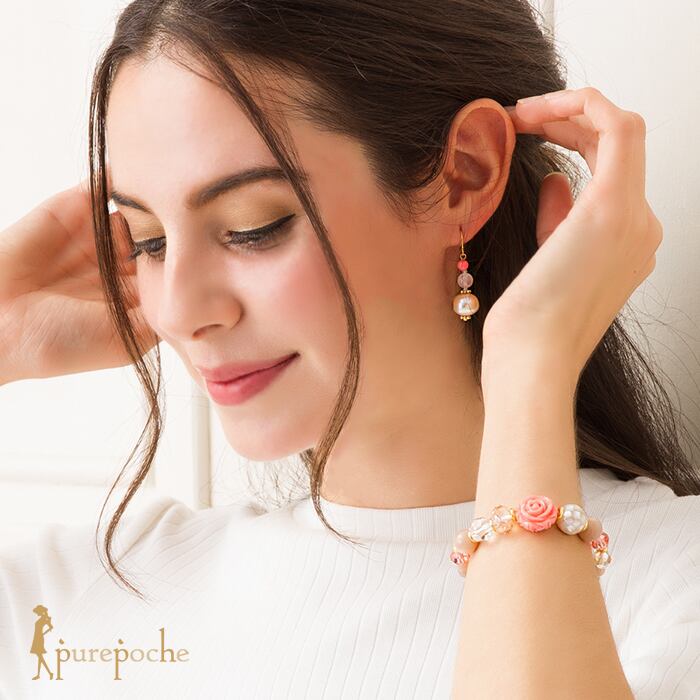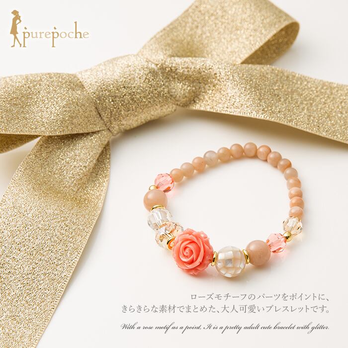 ローズモチーフのパーツをポイントに、きらきらな素材でまとめた、大人可愛いブレスレットです。キュートな装いにぴったりなブレスレットです。