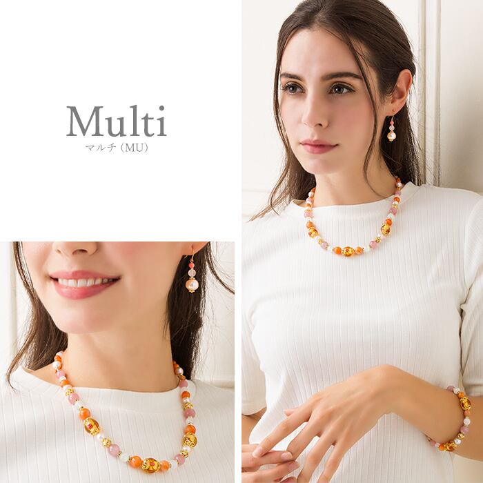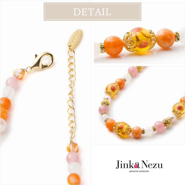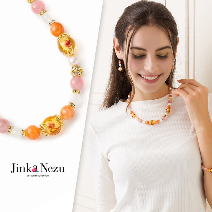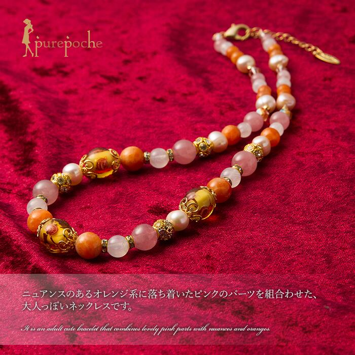 ニュアンスのあるオレンジ系に落ち着いたピンクのパーツを組合わせた、大人っぽいネックレスです。間にはさんだキラキラパーツでより華やかに。
