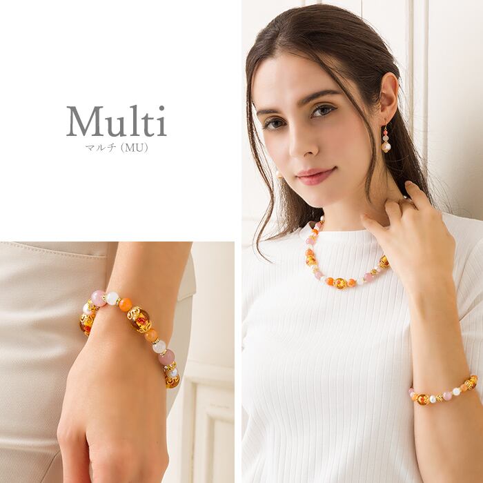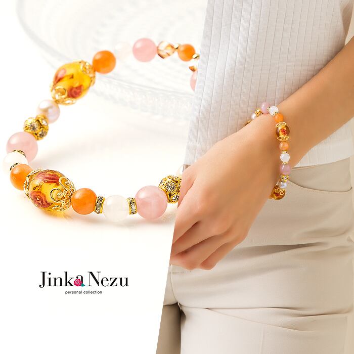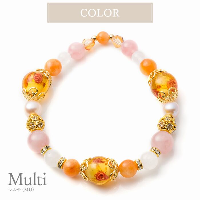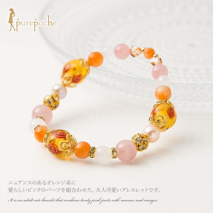 ニュアンスのあるオレンジ系に愛らしいピンクのパーツを組合わせた、大人可愛いブレスレットです。間にはさんだキラキラパーツでより華やかに。