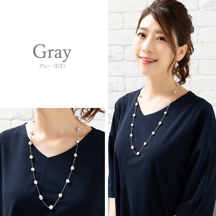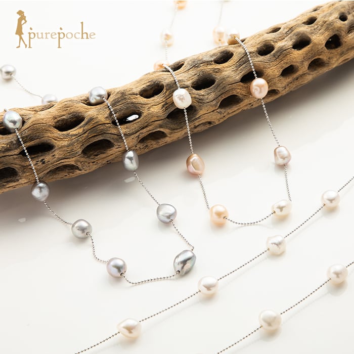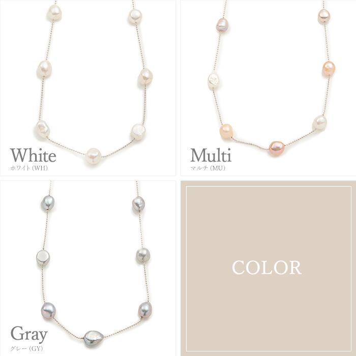 大きめのバロックパールを等間隔でレイアウトした、ステーションネックレスです。70cmの長さが胸元を明るく演出します。