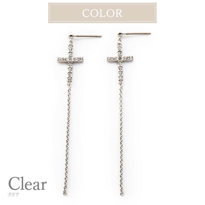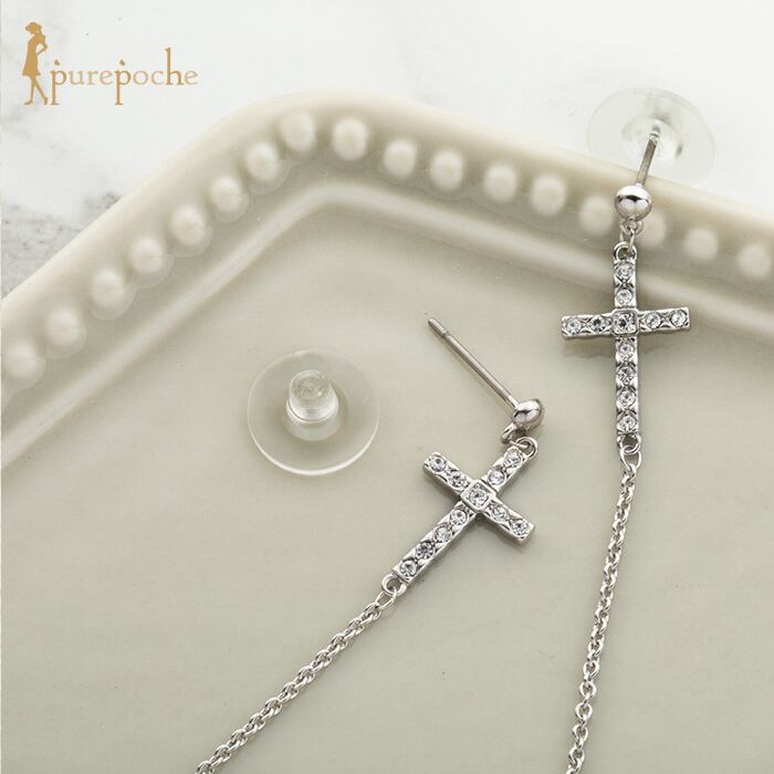 クロスモチーフにクリスタルガラスをレイアウトしたピアス。トレンド感のある長いフォルムが素敵です。