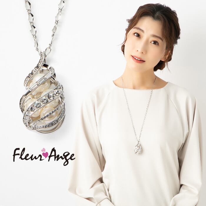 ネックレス ロング ペンダント 樹脂パール クリスタルガラス 流線 螺旋