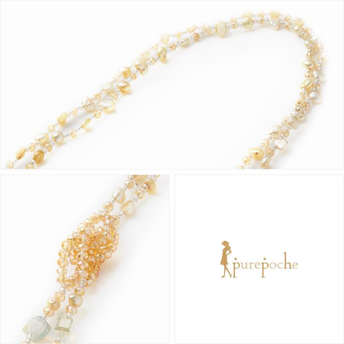 ガラスビーズやパールなど様々な素材を使用したネックレス。重ね付けデザインがボリュームがありゴージャスです。