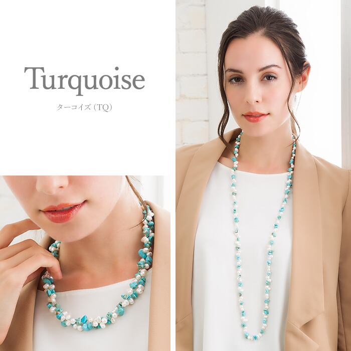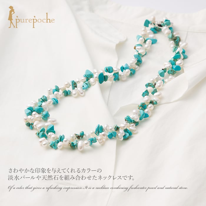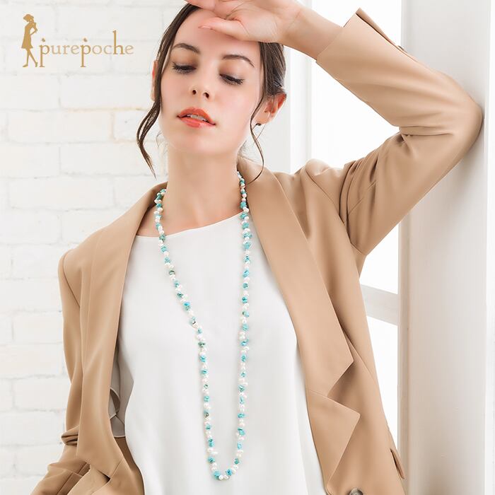 さわやかな印象を与えてくれるカラーの淡水パールや天然石を組み合わせたネックレスです。いろんな着け方を楽しめます。
