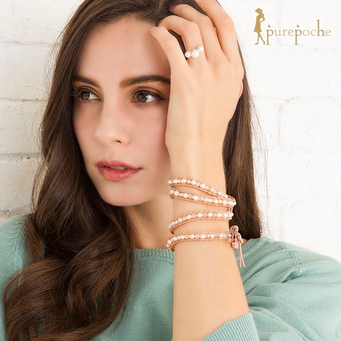 ガラスビーズと淡水パールを皮ひもで挟んで編み上げたループブレスレットです。3〜4連のブレスレットとしてお使いいただけ、スタイリッシュに装えます。
