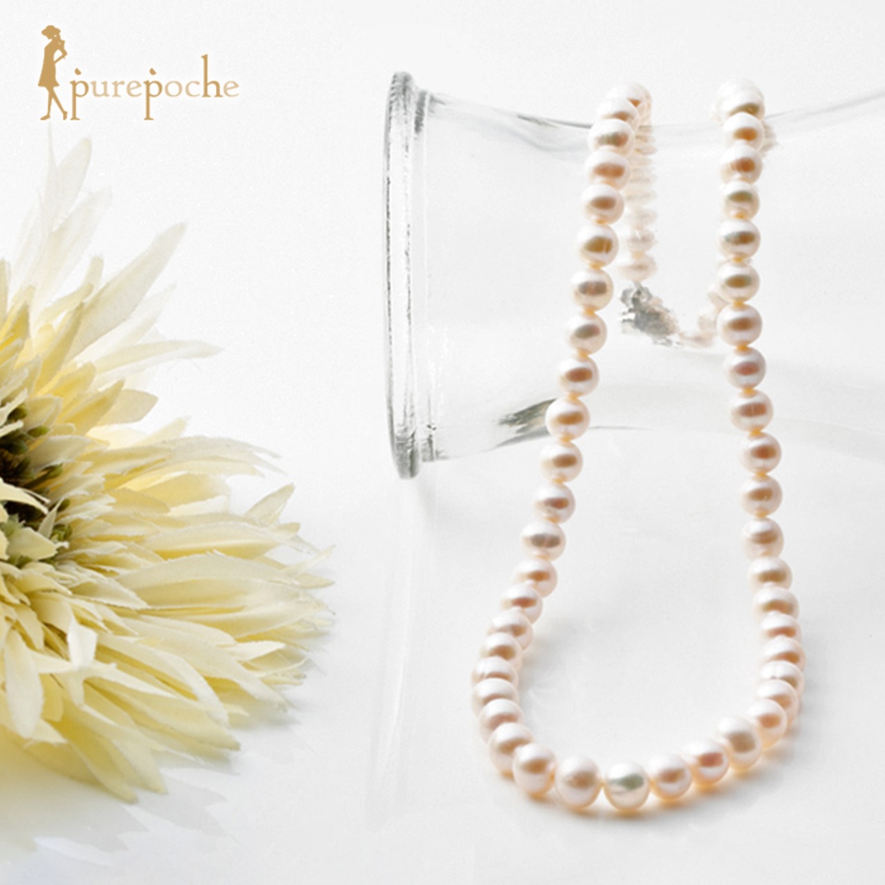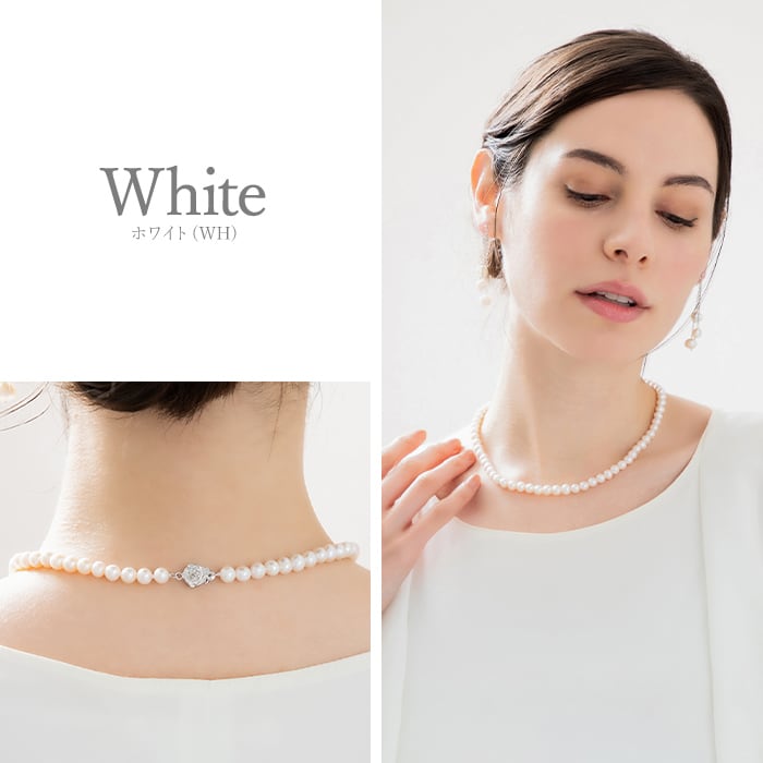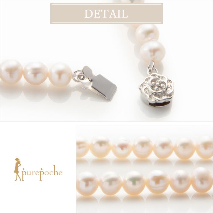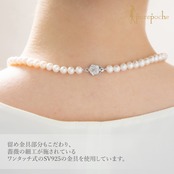 照りの良い淡水パールを使用しているためとても上品な印象を与えます。留め金具部分もこだわり、薔薇の細工が施されているワンタッチ式のSV925の金具を使用しています。フォーマルシーンには欠かせない一品です。