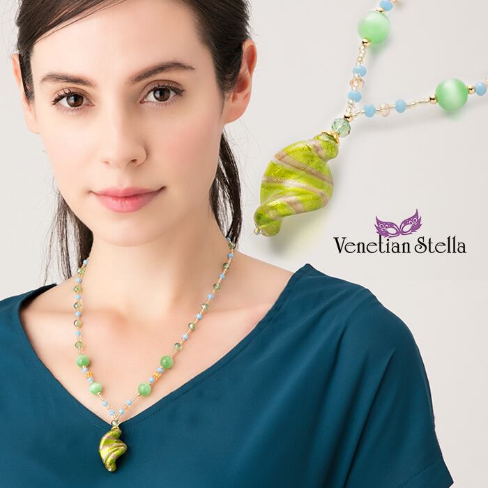エリカ(葉っぱをひねった形)にライトグリーンカラーのガラスにスパイラル状の模様を描いたヴェネチアンガラスビーズをトップに使ったなネックレスです。ネックラインも緑色系を基調にまとめ、顔周りを明るくし、年齢問わずお使いいただけるネックレスです。