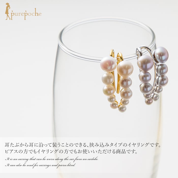 耳たぶから耳に沿って装うことのできる、挟み込みタイプのイヤリングです。ピアスの方でもイヤリングの方でもお使いいただける商品です。さまざまなファッションにもコーディネートしやすいデザインです。